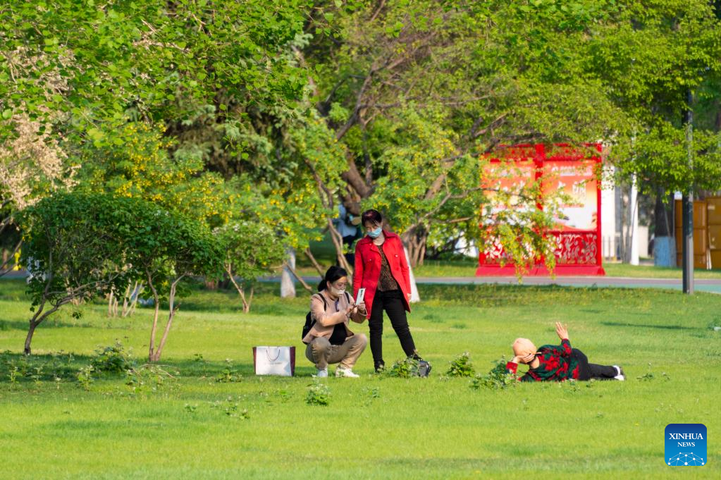 Tourists take photos at a park in Xiangfang District of Harbin, northeast China's Heilongjiang Province, May 19, 2022. Normal life in Harbin has gradually resumed as the latest COVID-19 resurgence waned. (Xinhua/Xie Jianfei)