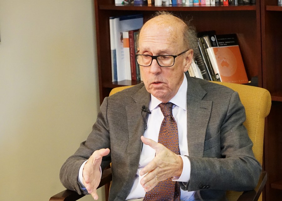 File photo shows Stephen Roach, senior fellow at Yale University's Jackson Institute of Global Affairs, speaking during an interview with Xinhua in New Haven, the United States, Feb. 6, 2020. (Xinhua/Xu Yuan)