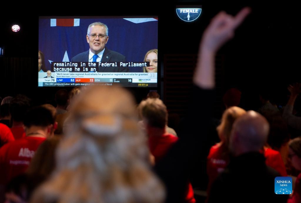 A screen displays Scott Morrison's reaction at the Labor Party headquarters in Sydney, Australia, May 21, 2022. Australian Prime Minister Scott Morrison has conceded defeat in the country's 2022 federal election held on Saturday. (Xinhua/Bai Xuefei)