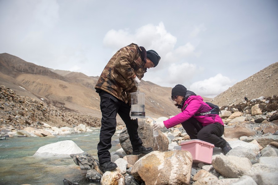 Scientific researchers collect water sample at the East Rongbuk glacier near Mount Qomolangma on April 30, 2022. (Xinhua/Dainzin Nyima Choktrul)