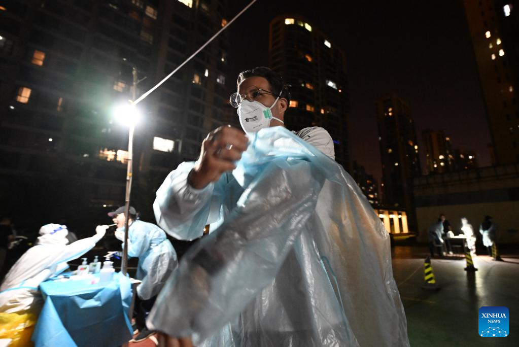 Iarroumets Jonathan takes off protective suit after volunteer work at a community in Nankai District, north China's Tianjin, May 20, 2022.