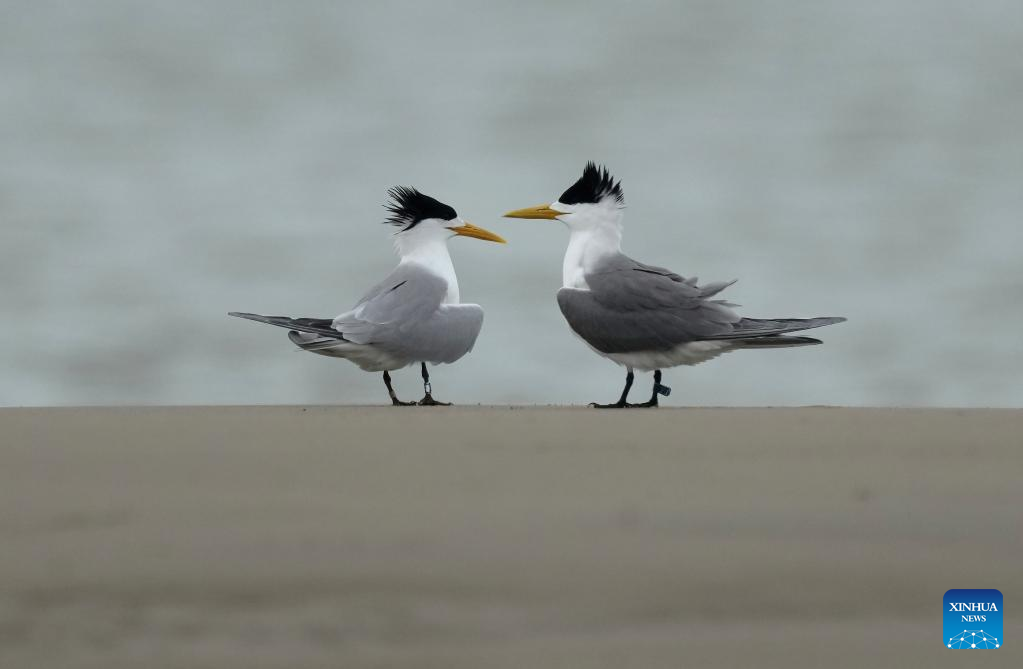 (220522) -- FUZHOU, May 22, 2022 (Xinhua) -- Chinese crested terns rest in the Minjiang River estuary nature reserve in southeast China's Fujian Province, May 20, 2022. Located on a major bird migration route between East Asia and Australia, the Minjiang River estuary nature reserve is a stopover for over 50,000 waterfowls each year. (Xinhua/Wei Peiquan)
