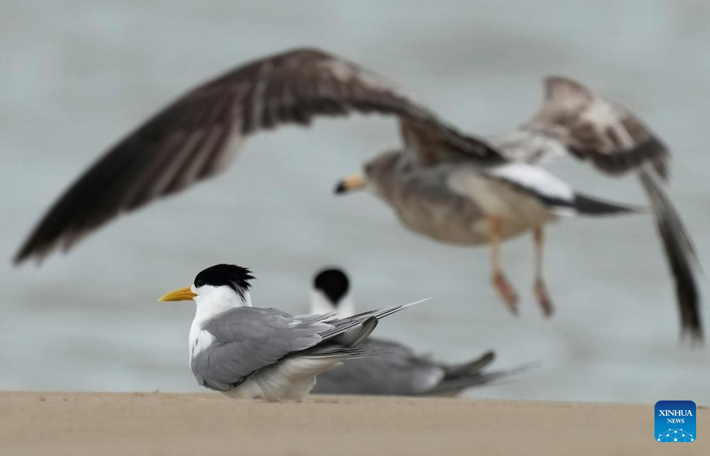(220522) -- FUZHOU, May 22, 2022 (Xinhua) -- Chinese crested terns and a black-tailed gull are seen in the Minjiang River estuary nature reserve in southeast China's Fujian Province, May 20, 2022. Located on a major bird migration route between East Asia and Australia, the Minjiang River estuary nature reserve is a stopover for over 50,000 waterfowls each year. (Xinhua/Wei Peiquan)