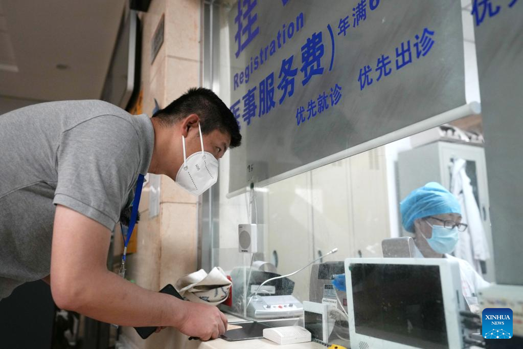 Mei Xiaodong (L) registers at a community medical service center to purchase medicine ordered by residents under home quarantine in Chaoyang District in Beijing, capital of China, May 21, 2022.