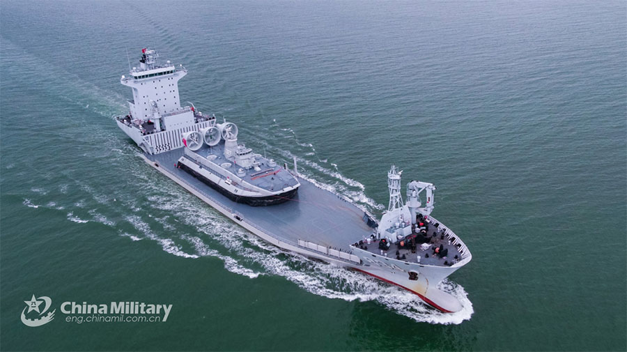 The minesweeper Suizhou (Hull 834) attached to a landing ship group with the navy under the PLA Southern Theater Command transports an air-cushioned landing craft (LCAC) to a specific location during the maritime transportation training on May 14, 2022. (eng.chinamil.com.cn/Photo by Li Jia)