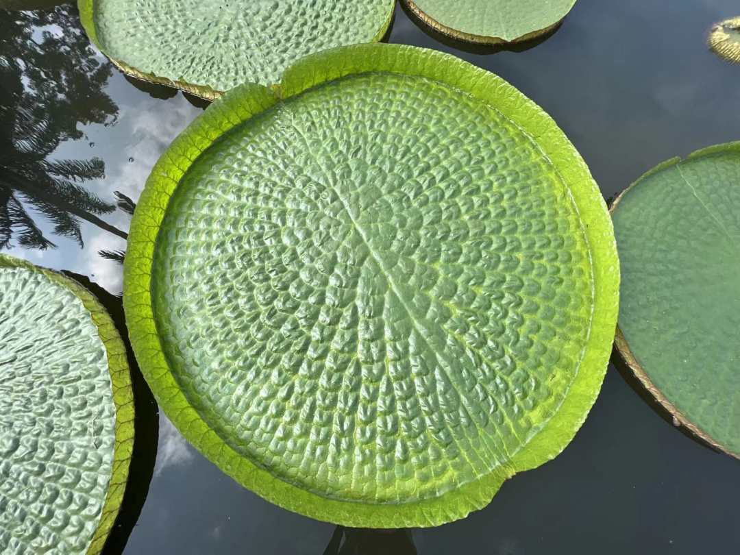 The king lotus leave is a famous aquatic plant with a maximum diameter of over 2 meters. The edges of the lotus leaves curl upward, resembling large plates floating on the water. With their strong veins, the leaves have a great buoyancy as they are filled with many small holes, being able to bear up to 60 or 70 kilograms.
