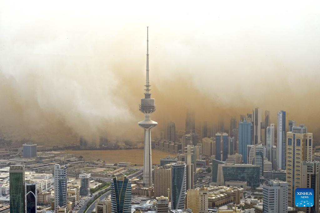 Photo taken on May 23, 2022 shows buildings shrouded in strong dust storm in Kuwait City, Kuwait. (Xinhua)