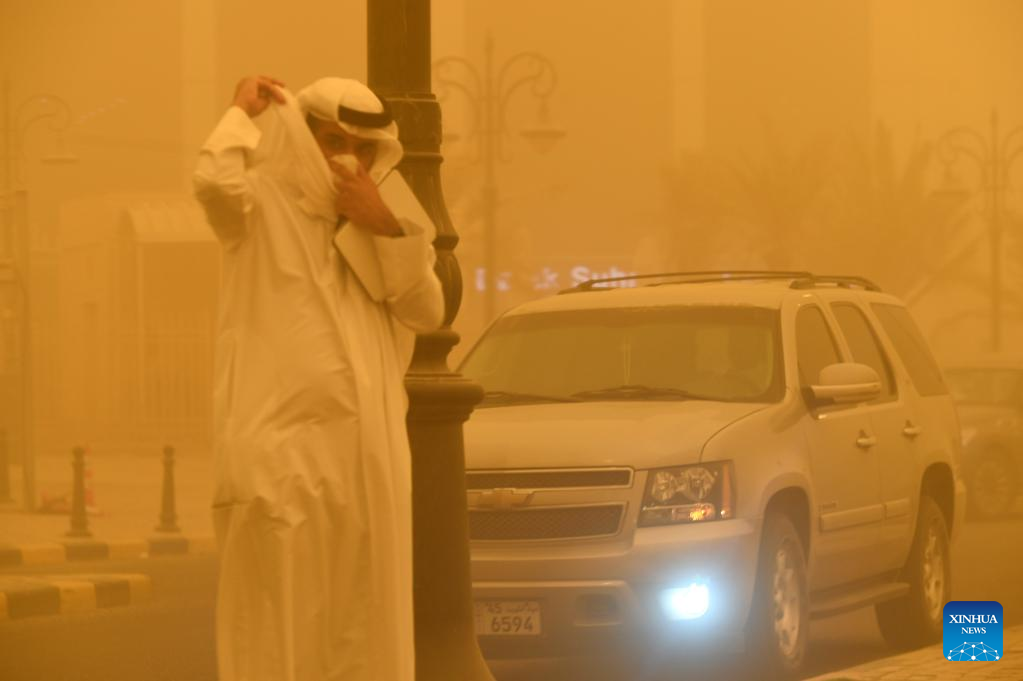 A man walks at a street amid strong dust storm in Kuwait City, Kuwait, on May 23, 2022. (Xinhua)