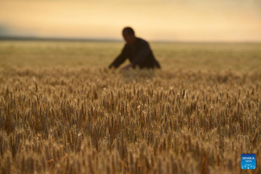 A farmer checks wheat in the fields in Yangzhuang Village of Fuyang, east China's Anhui Province, May 21, 2022. (Photo by Lu Qijian/Xinhua)