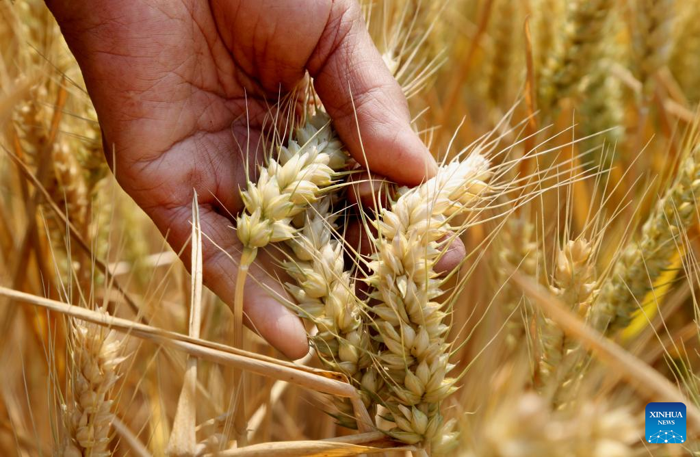 A farmer checks wheat in the fields in Hanli Village of Lianyungang, east China's Jiangsu Province, May 21, 2022. (Photo by Wang Chun/Xinhua)