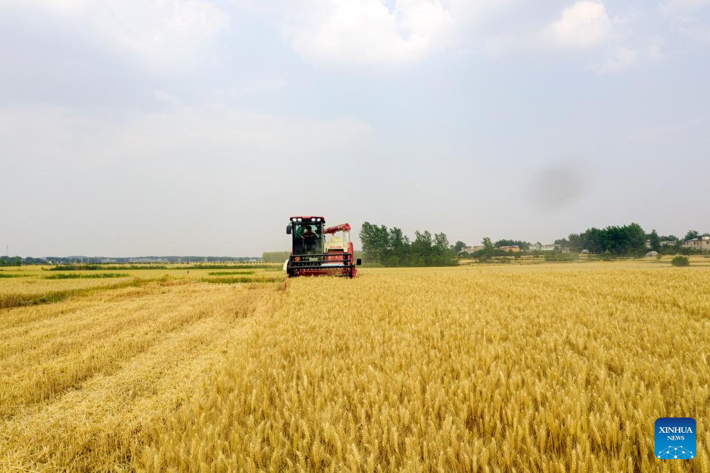 Aerial photo shows farmers harvesting wheat in the fields in Huozhuang Village of Wuhe County, east China's Anhui Province, May 23, 2022. (Photo by Li Xiangqian/Xinhua)
