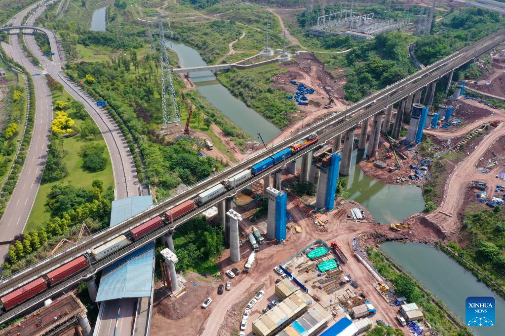 Aerial photo shows the first international freight train linking Chongqing and Lincang in southwest China with Myanmar departing from the Yuzui station in Chongqing, southwest China, on May 23, 2022. Carrying 60 twenty-foot equivalent units (TEU) of mechanical equipment, electronic and auto parts, the train will pass through Lincang in southwest China's Yunnan province and arrive at Myanmar's Mandalay in about 15 days. This new freight train route can save about 20 days compared with traditional logistics routes and reduce 20 percent of logistics cost. (Xinhua/Tang Yi)