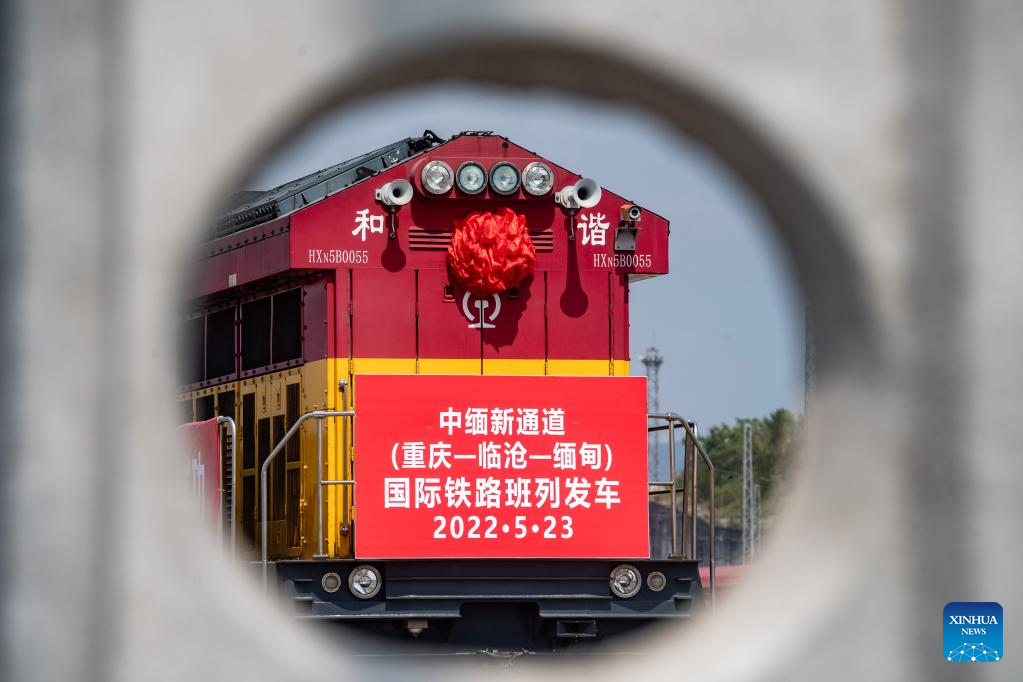 The first international freight train linking Chongqing and Lincang in southwest China with Myanmar is about to set off from the Yuzui station in Chongqing, southwest China, on May 23, 2022. Carrying 60 twenty-foot equivalent units (TEU) of mechanical equipment, electronic and auto parts, the train will pass through Lincang in southwest China's Yunnan province and arrive at Myanmar's Mandalay in about 15 days. This new freight train route can save about 20 days compared with traditional logistics routes and reduce 20 percent of logistics cost. (Xinhua/Tang Yi)