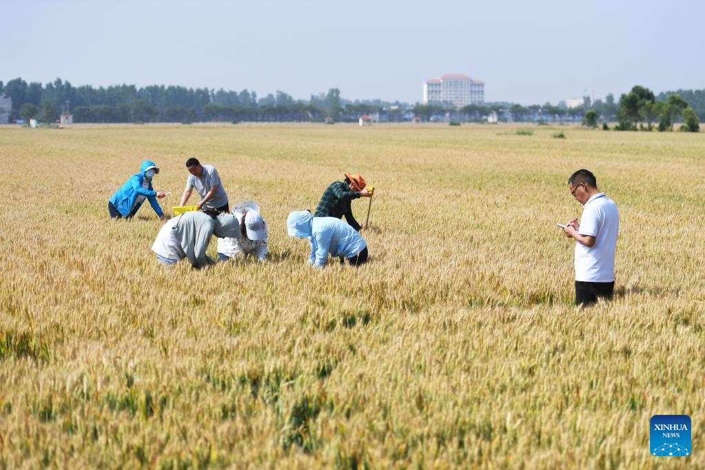 Agricultural technicians carry out the yield measurement of wheat at Xialou Village of Yaodian Township in Dengzhou, central China's Henan Province, on May 24, 2022. (Xinhua/Zhang Haoran)