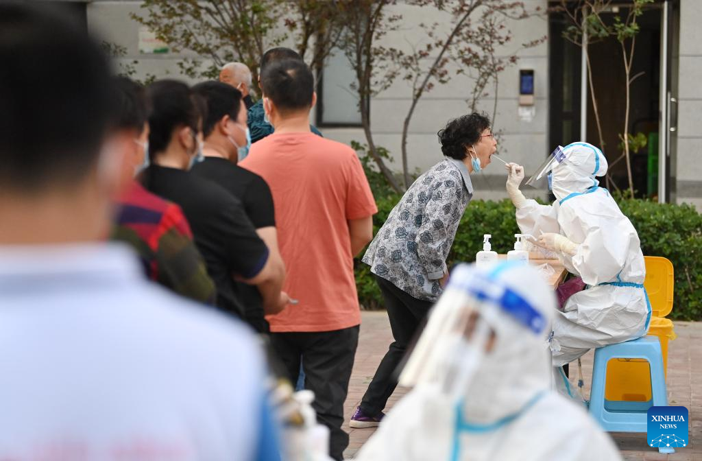 Residents queue for nucleic acid tests at a residential area in Xiqing District, north China's Tianjin, May 21, 2022. (Xinhua/Li Ran)