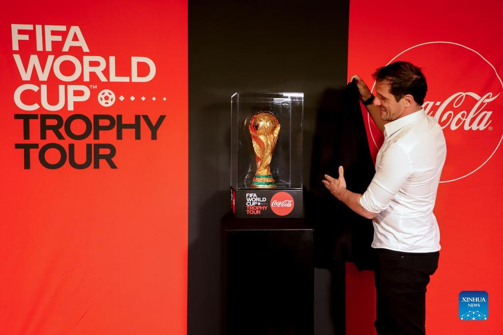 Former Brazilian football player Juliano Belletti unveils the trophy during the FIFA World Cup Trophy Tour event in Addis Ababa, Ethiopia, on May 24, 2022. (Xinhua/Michael Tewelde)
