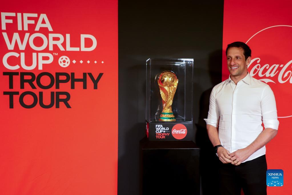 Former Brazilian football player Juliano Belletti poses with the trophy during the FIFA World Cup Trophy Tour event in Addis Ababa, Ethiopia, on May 24, 2022. (Xinhua/Michael Tewelde)