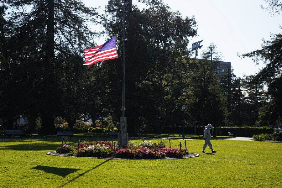 A U.S. flag flies at half-mast in the Central Park in San Mateo, the United States, on May 12, 2022. (Xinhua/Wu Xiaoling)