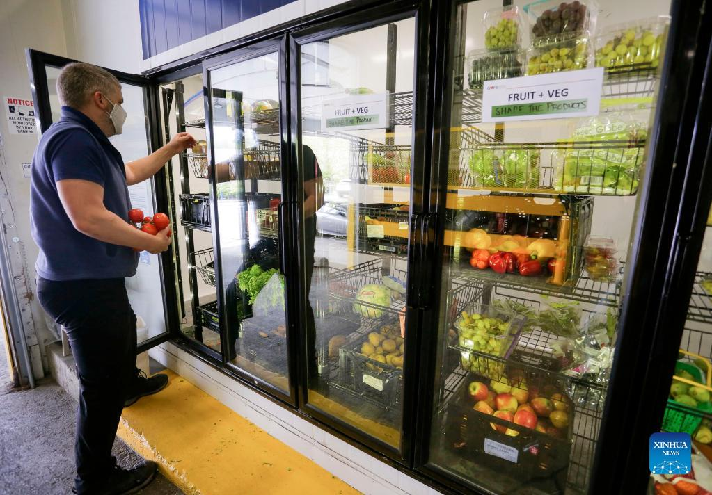 A volunteer organizes the fresh vegetables inside the Greater Vancouver Food Bank's facility in Burnaby, British Columbia, Canada, on May 25, 2022. Due to the COVID-19 pandemic and high inflation, there are more people demanding food from the food banks, according to a spokesperson from Greater Vancouver Food Bank. (Photo by Liang Sen/Xinhua)