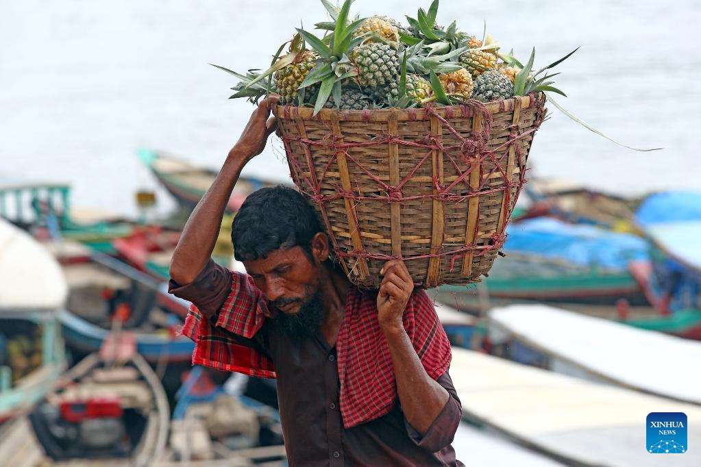 A man carries a basket of pineapples at a floating market in Rangamati, Bangladesh, on May 22, 2022. (Xinhua)