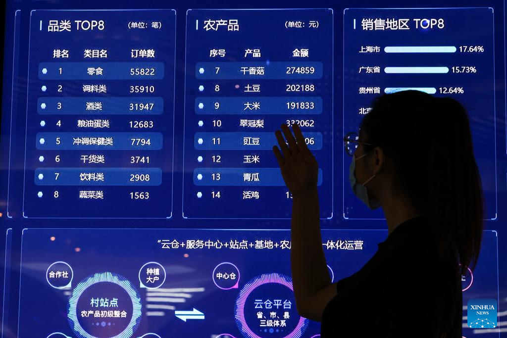 A staff member introduces the data screen of a "online warehouse" at the exhibition center of the national big data (Guizhou) comprehensive pilot zone in southwest China's Guizhou Province, May 26, 2022. The China International Big Data Industry Expo 2022 opened online on Thursday.