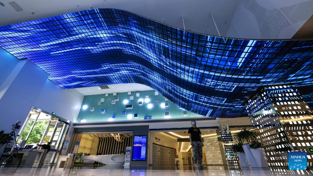 A staff member watches a video at the exhibition center of the national big data (Guizhou) comprehensive pilot zone in southwest China's Guizhou Province, May 26, 2022. The China International Big Data Industry Expo 2022 opened online on Thursday.