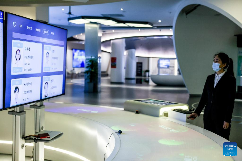 A staff member demonstrates an online diagnosis and treatment system at the exhibition center of the national big data (Guizhou) comprehensive pilot zone in southwest China's Guizhou Province, May 26, 2022. The China International Big Data Industry Expo 2022 opened online on Thursday.