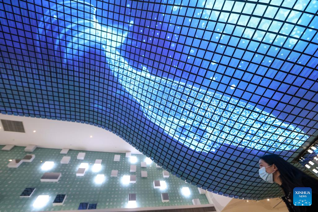 A staff member watches a video about China's Five-hundred-meter Aperture Spherical Radio Telescope (FAST) at the exhibition center of the national big data (Guizhou) comprehensive pilot zone in southwest China's Guizhou Province, May 26, 2022. The China International Big Data Industry Expo 2022 opened online on Thursday.