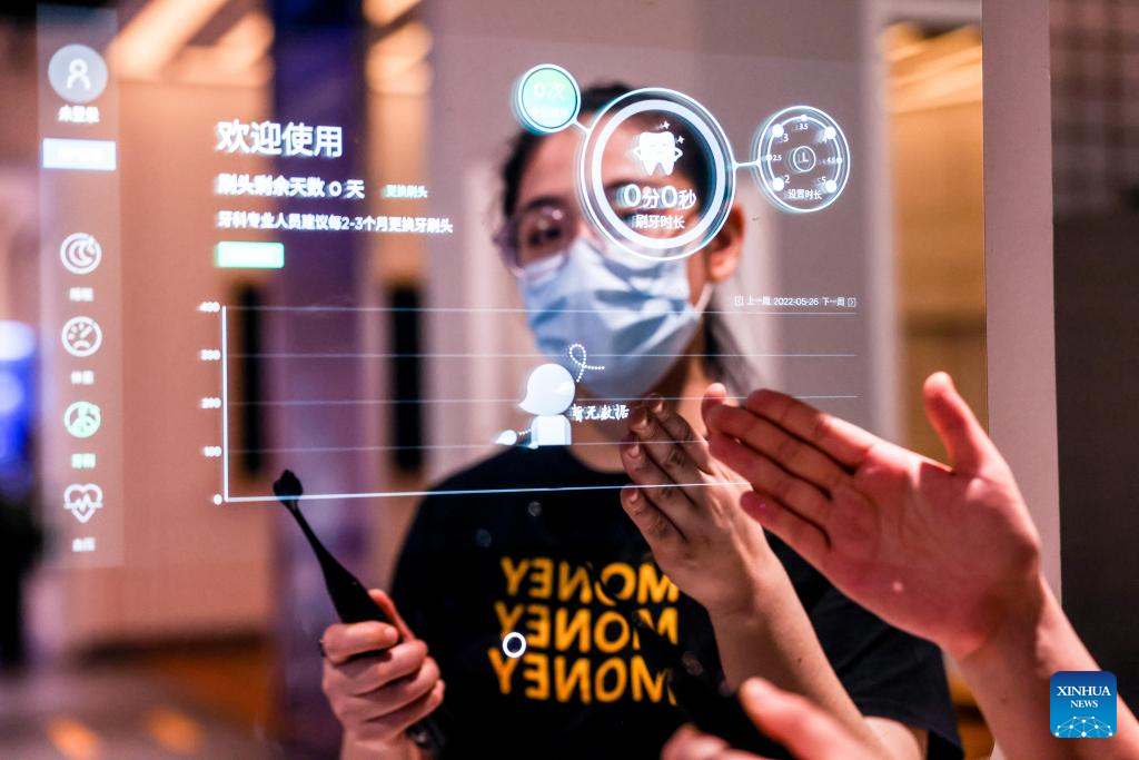 A staff member introduces an intelligent mirror at the exhibition center of the national big data (Guizhou) comprehensive pilot zone in southwest China's Guizhou Province, May 26, 2022. The China International Big Data Industry Expo 2022 opened online on Thursday.