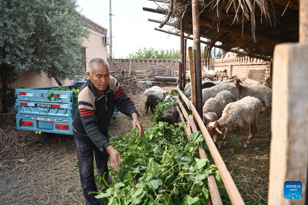 Maiming Reheman feeds sheep in Turpan, northwest China's Xinjiang Uygur Autonomous Region, May 20, 2022.