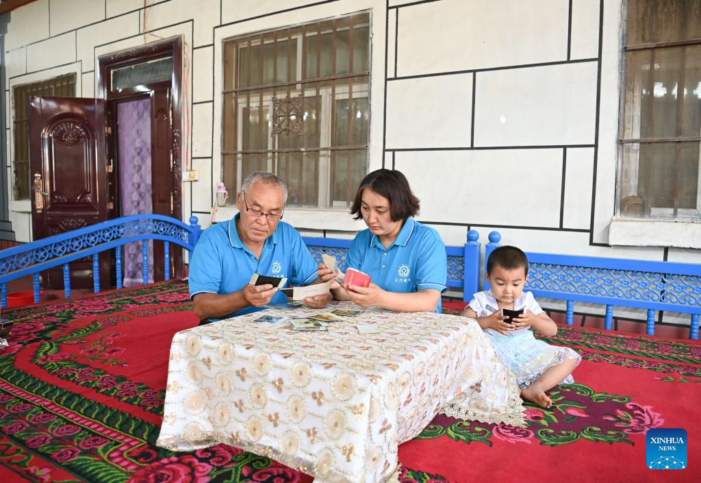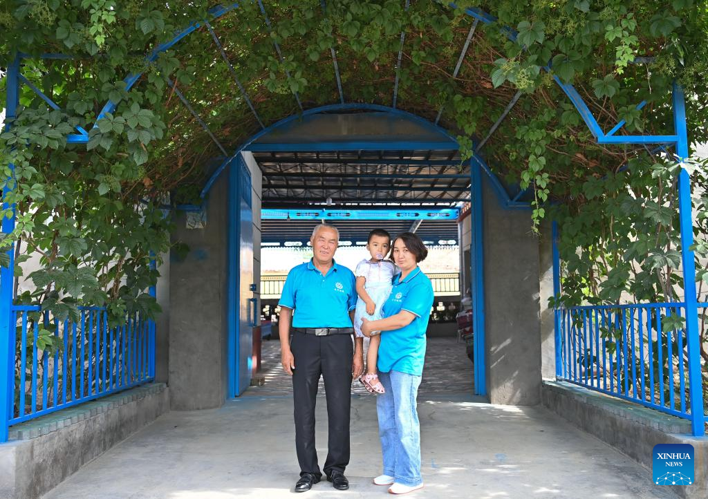 Gulibekge Maiming Reheman (R), her daughter (C) and Maiming Reheman pose for photos in Turpan, northwest China's Xinjiang Uygur Autonomous Region, May 20, 2022.