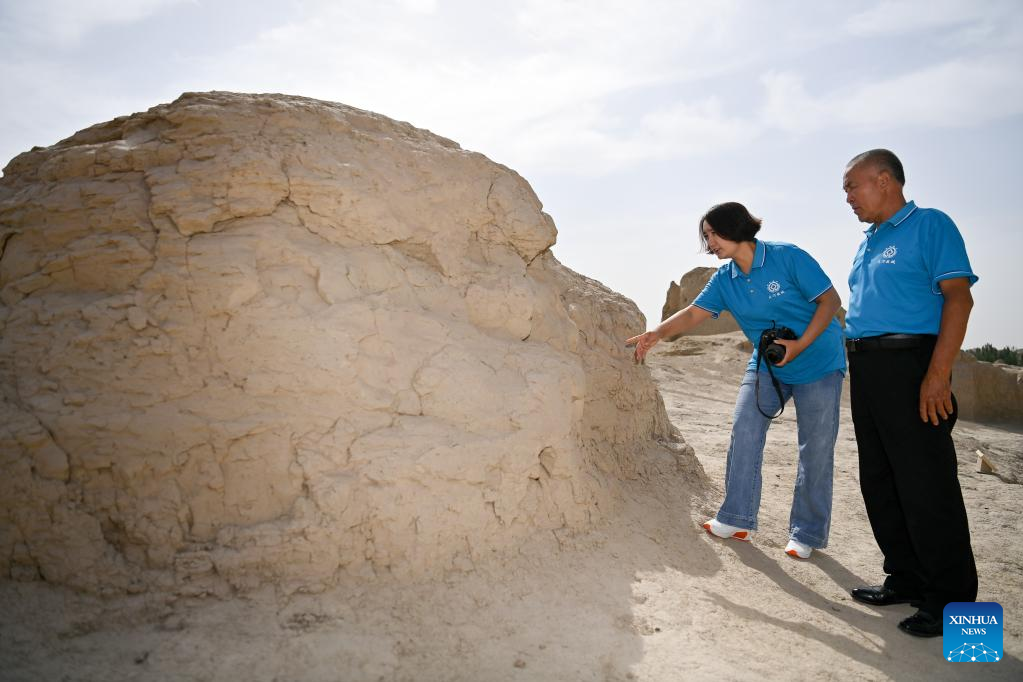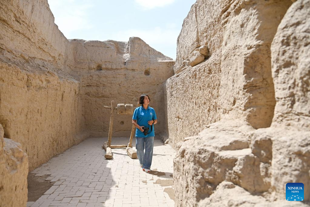 Gulibekge Maiming Reheman checks the impact of plants on the ancient wall at Jiaohe ancient city, Turpan, northwest China's Xinjiang Uygur Autonomous Region, May 20, 2022.
