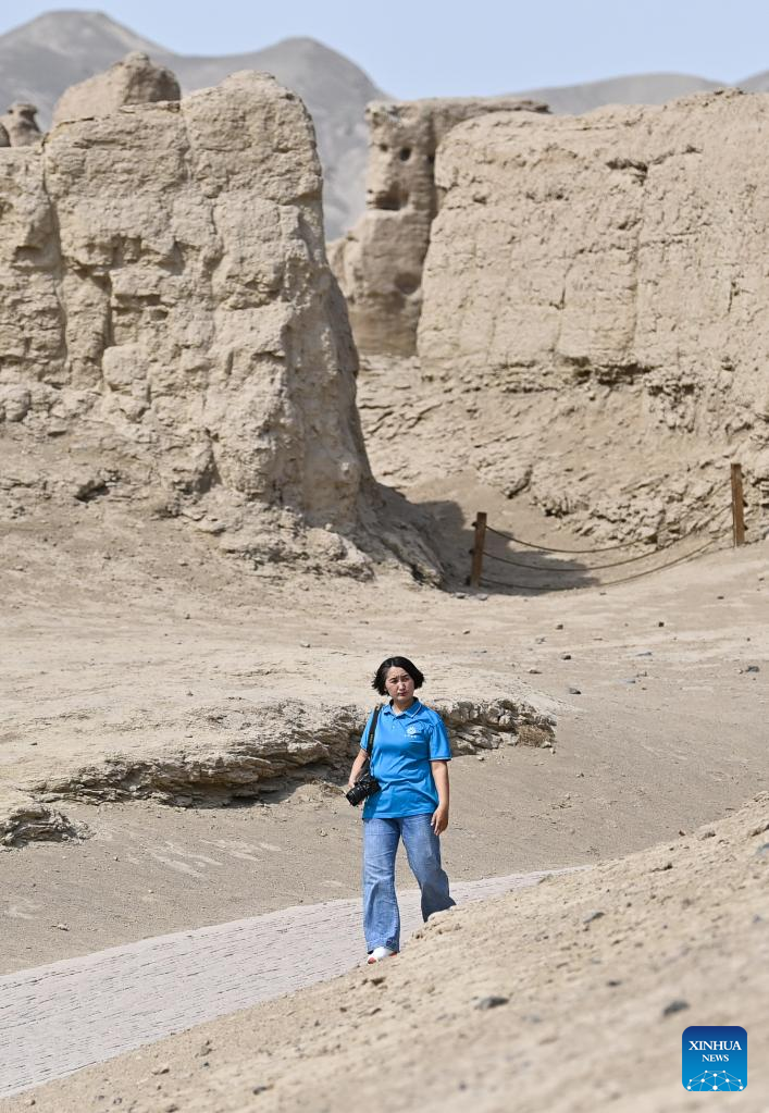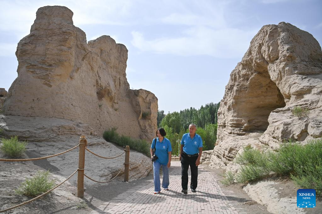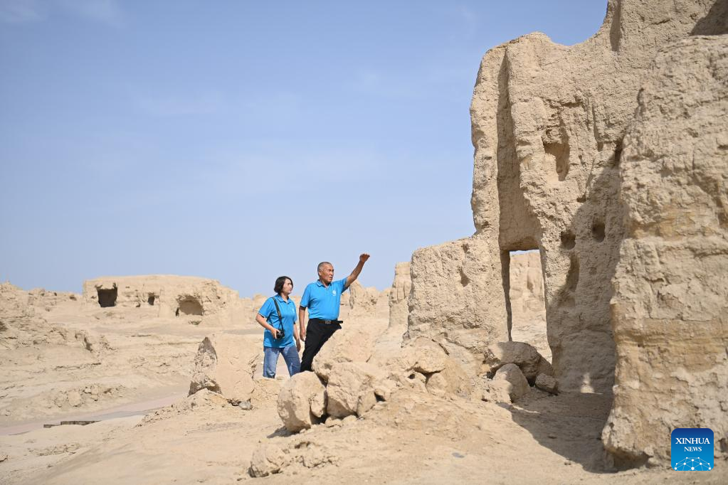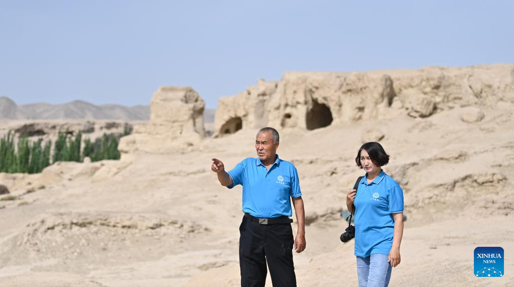 Gulibekge Maiming Reheman (C) introduces Jiaohe ancient city to tourists at the ancient city in Turpan, northwest China's Xinjiang Uygur Autonomous Region, May 20, 2022.