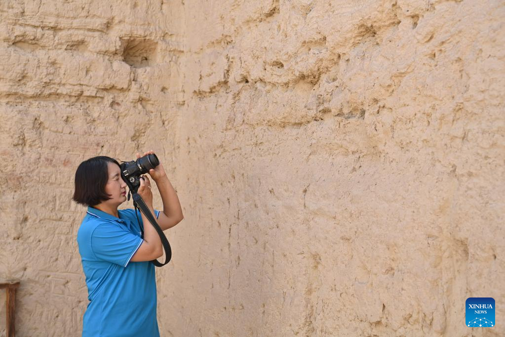 Gulibekge Maiming Reheman takes photos at Jiaohe ancient city, Turpan, northwest China's Xinjiang Uygur Autonomous Region, May 20, 2022.