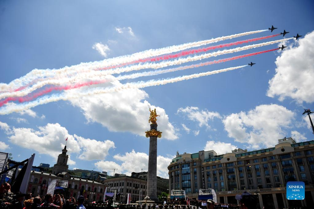 Georgian military aircraft fly over the Freedom Square to celebrate Georgia's Independence Day in Tbilisi, capital of Georgia, on May 26, 2022. (Photo by Kulumbegashvili Tamuna/Xinhua)
