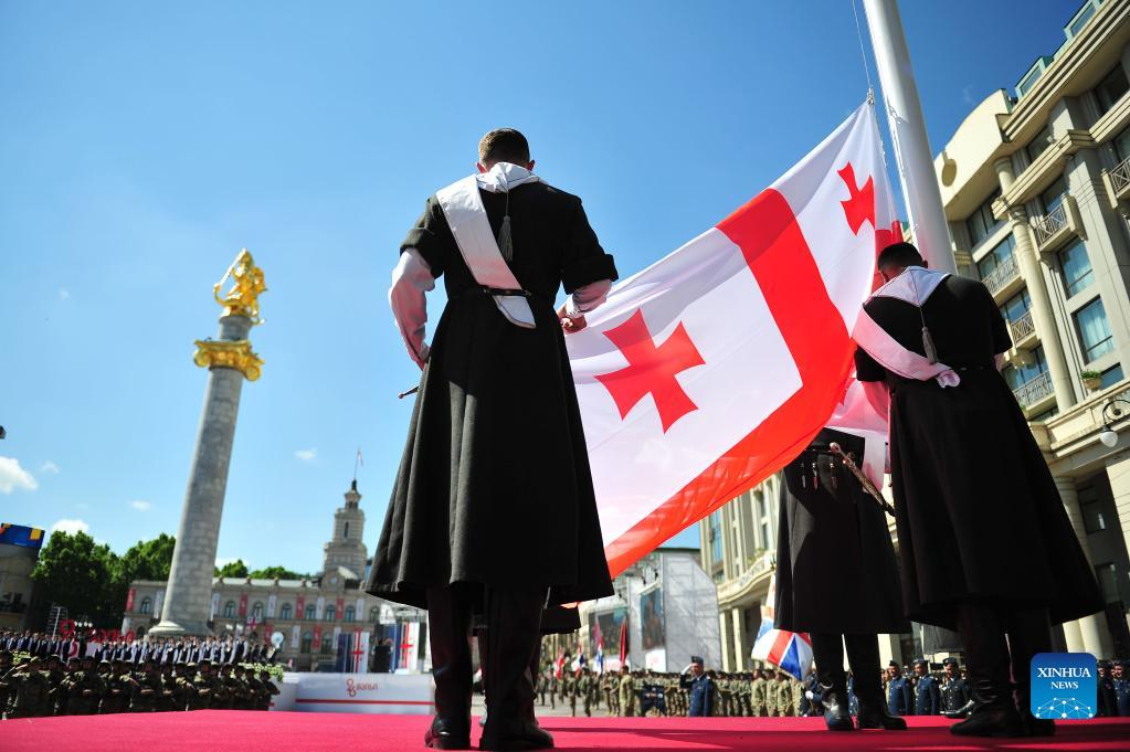 A ceremony is held to celebrate Georgia's Independence Day at the Freedom Square in Tbilisi, capital of Georgia, on May 26, 2022. (Photo by Kulumbegashvili Tamuna/Xinhua)