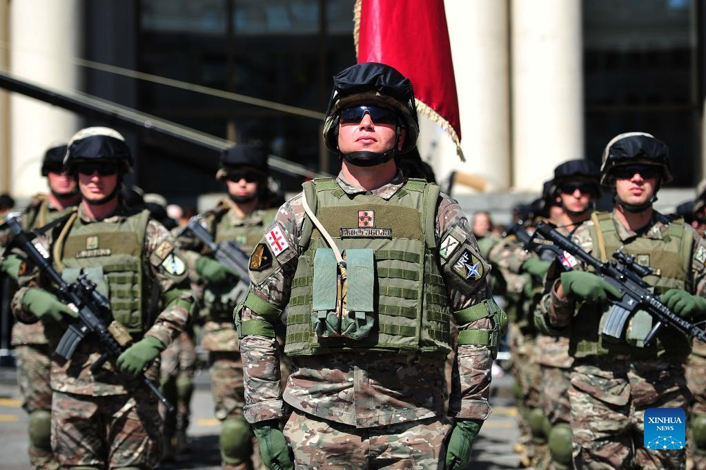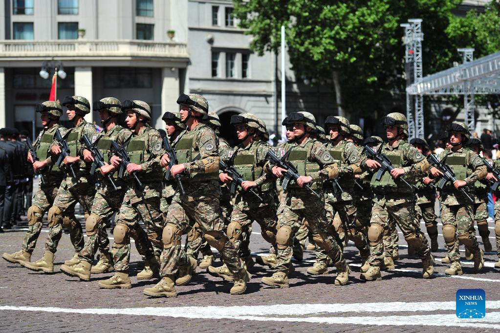 Georgian military personnel participate in the parade to celebrate Georgia's Independence Day at the Freedom Square in Tbilisi, capital of Georgia, on May 26, 2022. (Photo by Kulumbegashvili Tamuna/Xinhua)