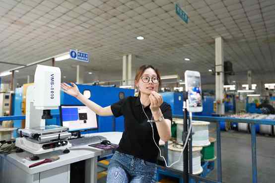 An employee of a cable producer in Nanxun district, Huzhou, east China’s Zhejiang province introduces the company’s products and production lines on a livestream platform, June 16, 2020. (People’s Daily Online/Zhang Bin)