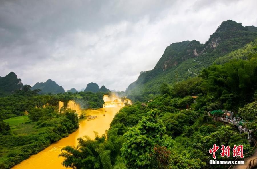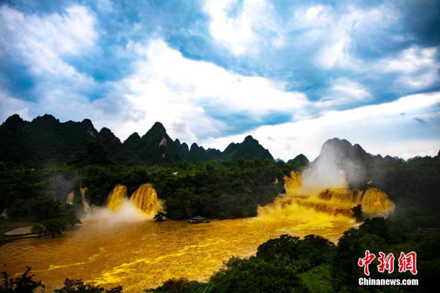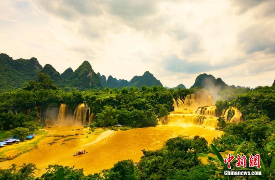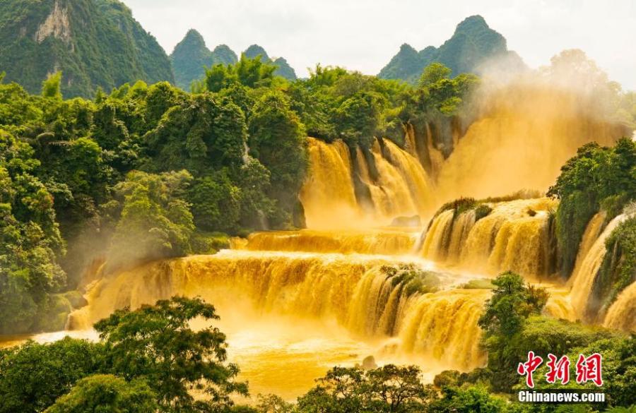 Detian waterfall forms a rare "golden waterfall" under the sun light due to the soared water volume. May 26, 2022. (Photo: China News Service/Yang Huwang)