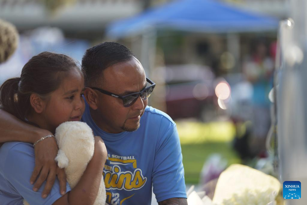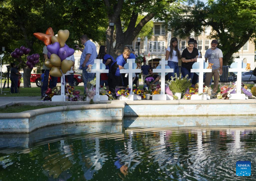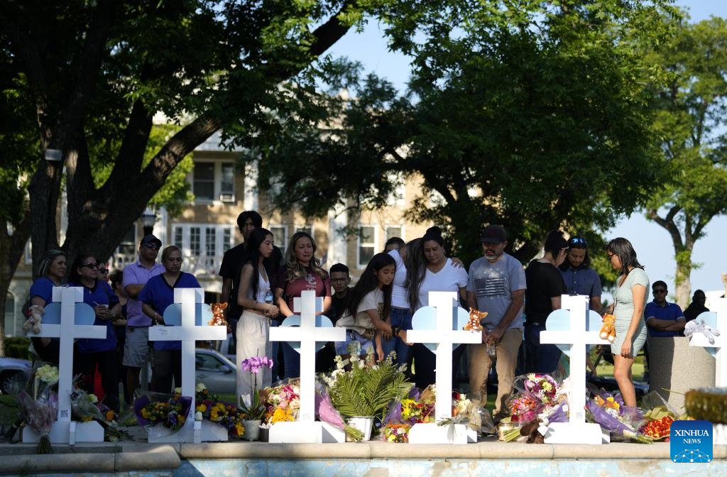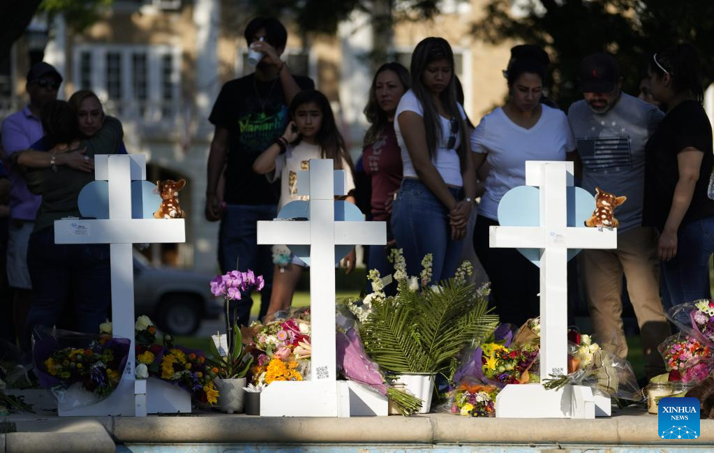 People mourn for victims of a school mass shooting in Uvalde, Texas, the United States, May 26, 2022. At least 19 children and two adults were killed in a shooting at Robb Elementary School in the town of Uvalde, Texas, on Tuesday. (Xinhua/Wu Xiaoling)