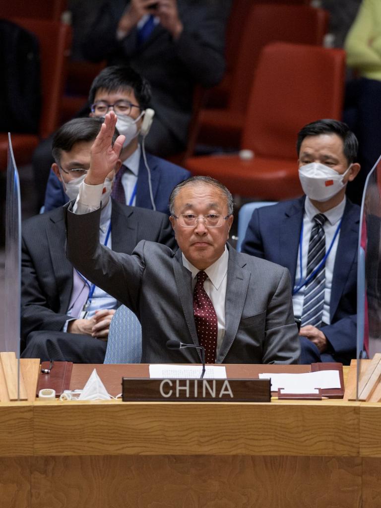 Zhang Jun, China's permanent representative to the United Nations, raises his hand to veto a UN Security Council draft resolution aimed to impose new sanctions on the Democratic People's Republic of Korea (DPRK), at the UN Headquarters in New York, on May 26, 2022. (Manuel Elias/UN Photo/Handout via Xinhua)