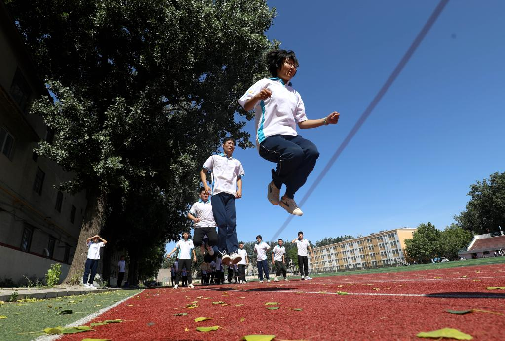 Senior high school students take part in a rope skipping game on campus at a high school in Jinzhou, north China's Hebei Province, May 27, 2022.