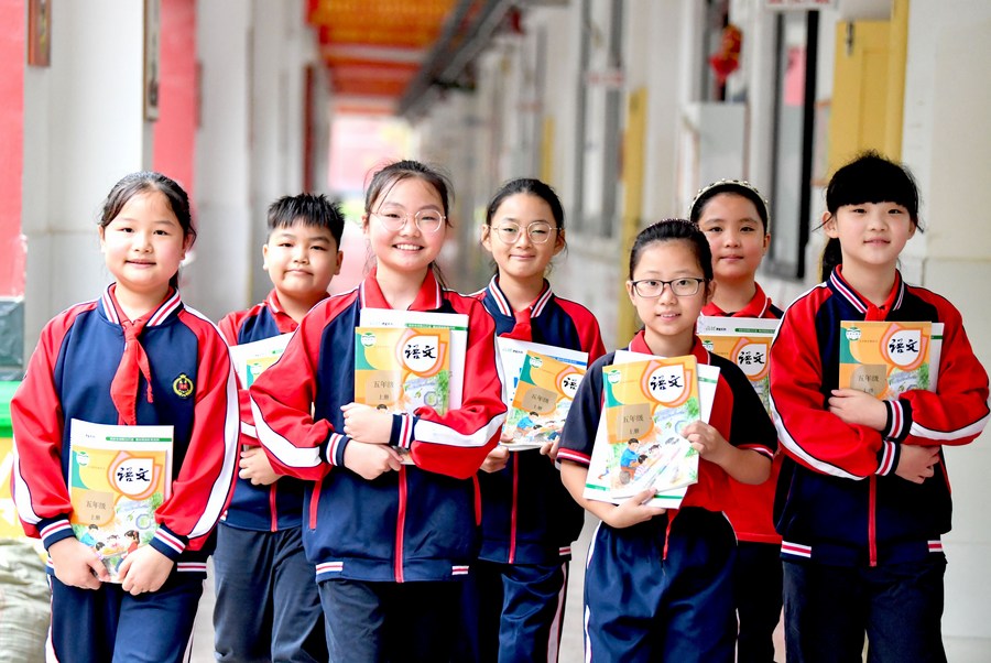 Students show their new textbooks at a primary school in Bozhou, east China's Anhui Province, Sept. 1, 2021. (Photo by Liu Qinli/Xinhua)