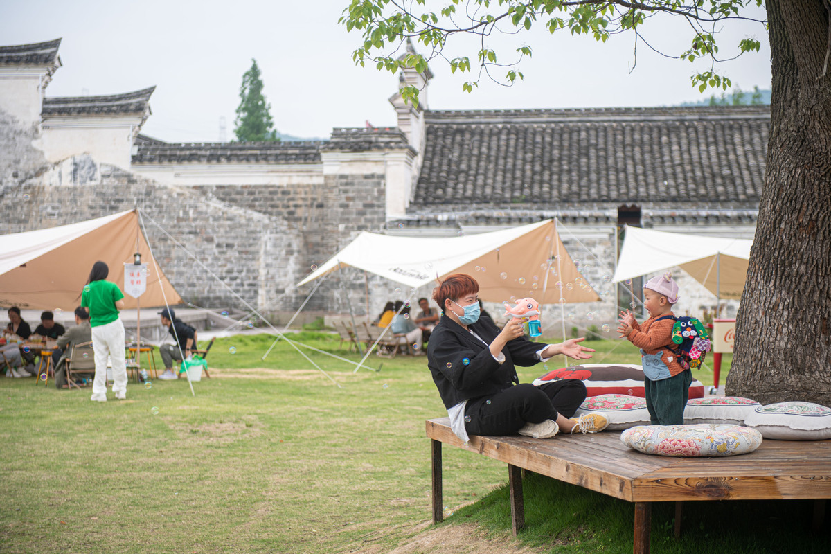 Tourists are seen at a camping site at Cicheng town in Jiangbei district, Ningbo, Zhejiang province on May 19, 2022. Outdoor activity products such as tents, otarp tents, folding tables and chairs as well as wild cookers all witnessed a skyrocketing sales growth. [Photo/Xinhua]