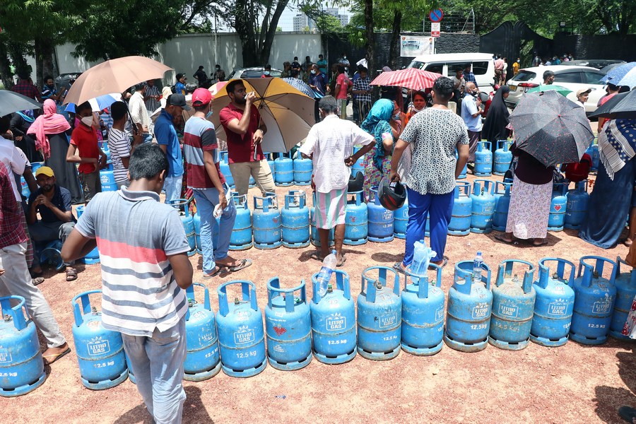 People wait with empty gas cylinders in Maradana, a suburb of Colombo, Sri Lanka, on May 20, 2022. (Photo by Ajith Perera/Xinhua)