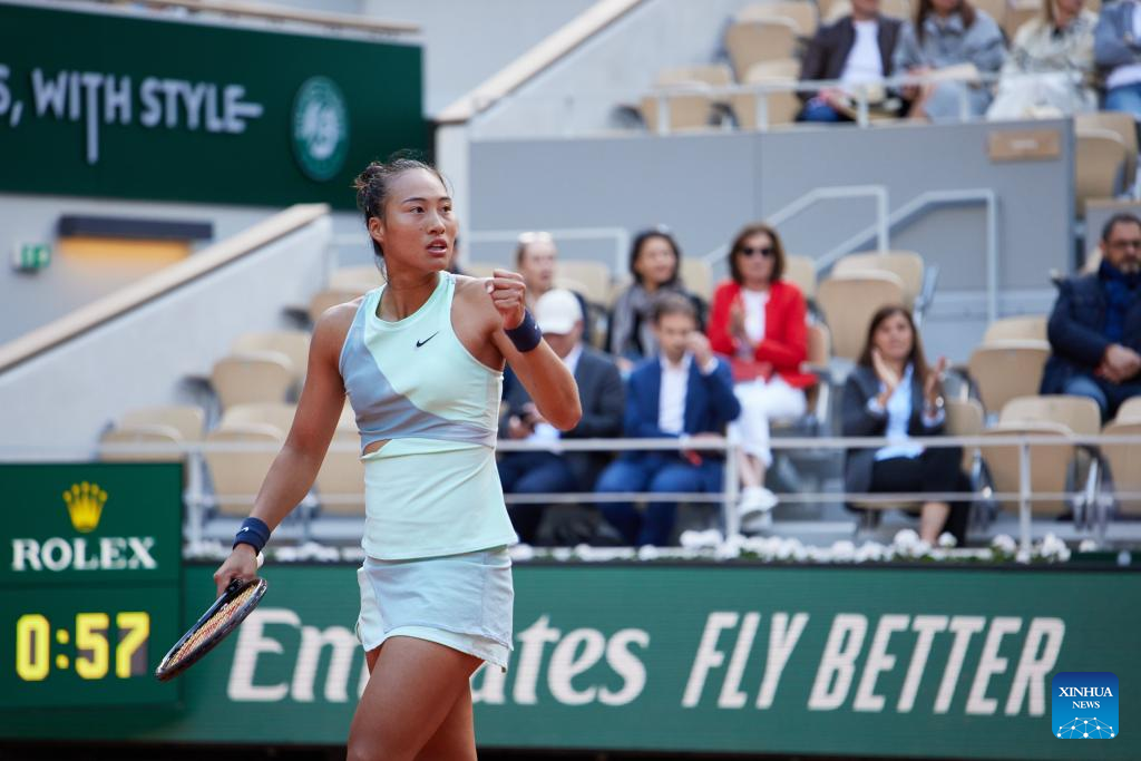 Zheng Qinwen celebrates a score during the women's singles fourth round match between Zheng Qinwen of China and Iga Swiatek of Poland at the French Open tennis tournament at Roland Garros in Paris, France, on May 30, 2022. (Xinhua/Meng Dingbo)