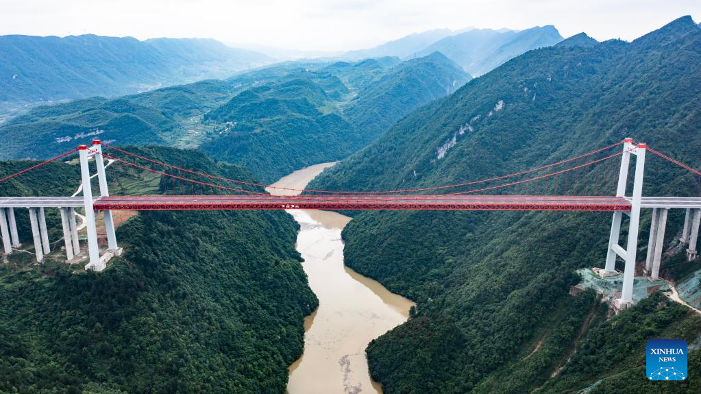 Aerial photo taken on May 30, 2022 shows the Yangbaoshan grand bridge along the Guiyang-Huangping Highway in southwest China's Guizhou Province. The Guiyang-Huangping Highway was opened to traffic on Tuesday, shortening the travel time between Guiyang City and Huangping County of Guizhou Province from the current 3.5 hours to just about one hour and 20 minutes. The main line of this highway stretches 120.6 kilometers and connects Guizhou with the Yangtze River Delta region. (Xinhua/Tao Liang)