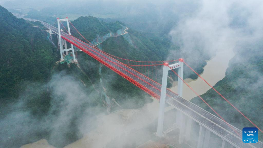 Aerial photo taken on May 31, 2022 shows the Yangbaoshan grand bridge along the Guiyang-Huangping Highway in southwest China's Guizhou Province. The Guiyang-Huangping Highway was opened to traffic on Tuesday, shortening the travel time between Guiyang City and Huangping County of Guizhou Province from the current 3.5 hours to just about one hour and 20 minutes. The main line of this highway stretches 120.6 kilometers and connects Guizhou with the Yangtze River Delta region. (Xinhua/Yang Wenbin)