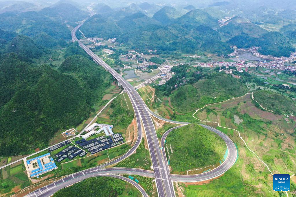 Aerial photo taken on May 31, 2022 shows the Guidingbei section of Guiyang-Huangping Highway in southwest China's Guizhou Province. The Guiyang-Huangping Highway was opened to traffic on Tuesday, shortening the travel time between Guiyang City and Huangping County of Guizhou Province from the current 3.5 hours to just about one hour and 20 minutes. The main line of this highway stretches 120.6 kilometers and connects Guizhou with the Yangtze River Delta region. (Xinhua/Yang Wenbin)