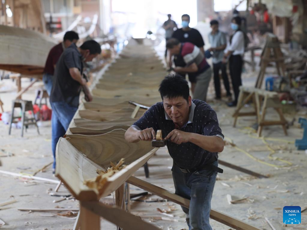Craftsmen build dragon boats at Fangzhongxiong dragon boat factory in Fangzhuang Village of Nantong Township in Minhou County of Fuzhou, southeast China's Fujian Province, May 30, 2022. Fangzhuang, known as "Dragon Boat Village", has a traditional dragon boat manufacturing history for more than 700 years. Every year, more than 200 hand-made wooden boats, carefully built by craftsmen, are sold nationwide and even overseas from the village. (Xinhua/Jiang Kehong)